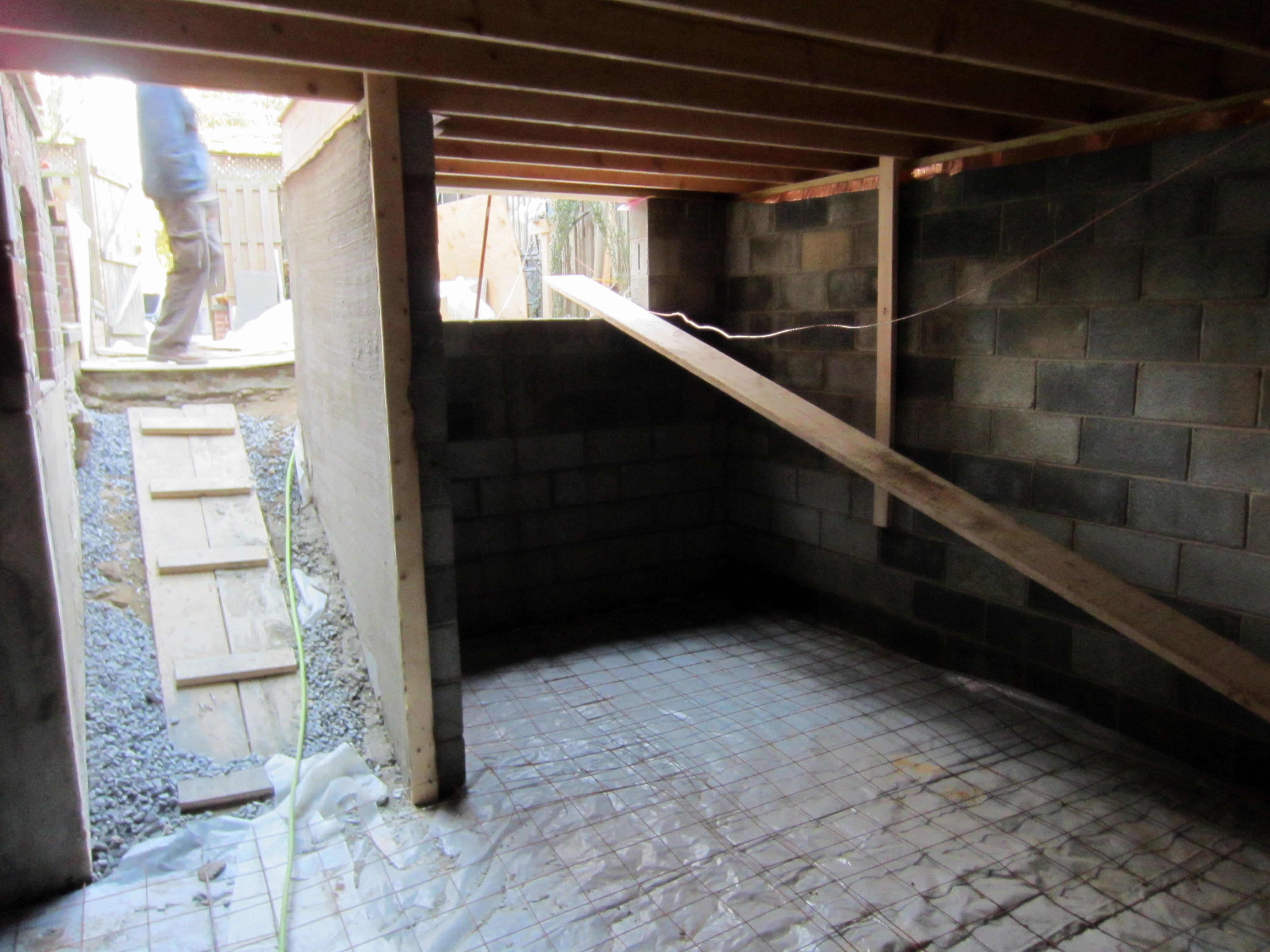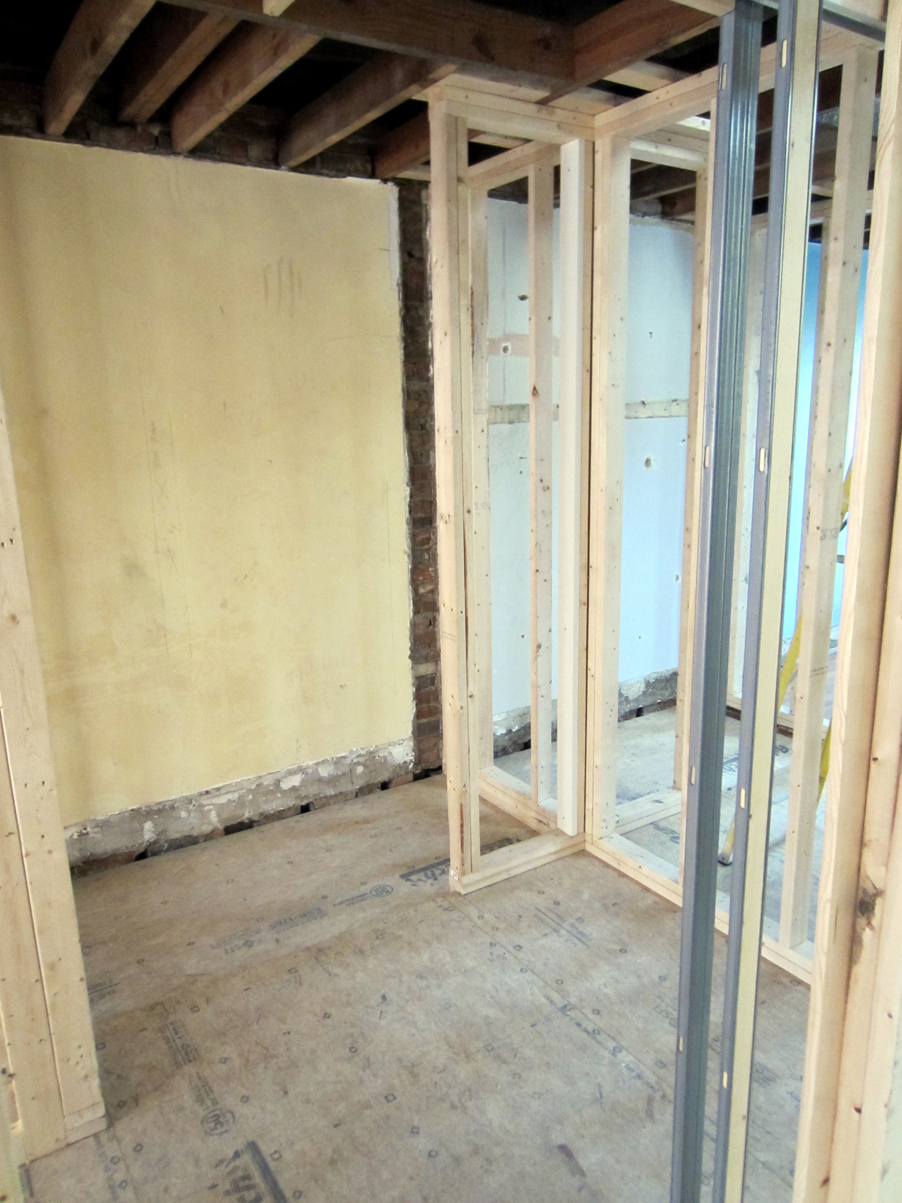 Looking north, so you can see both the powder room framing and the framining by the stairs where the AV niche will go. You can also see elements of the mechanical infrastructure, the installation of which we’ll cover in tortuous detail in a future post.