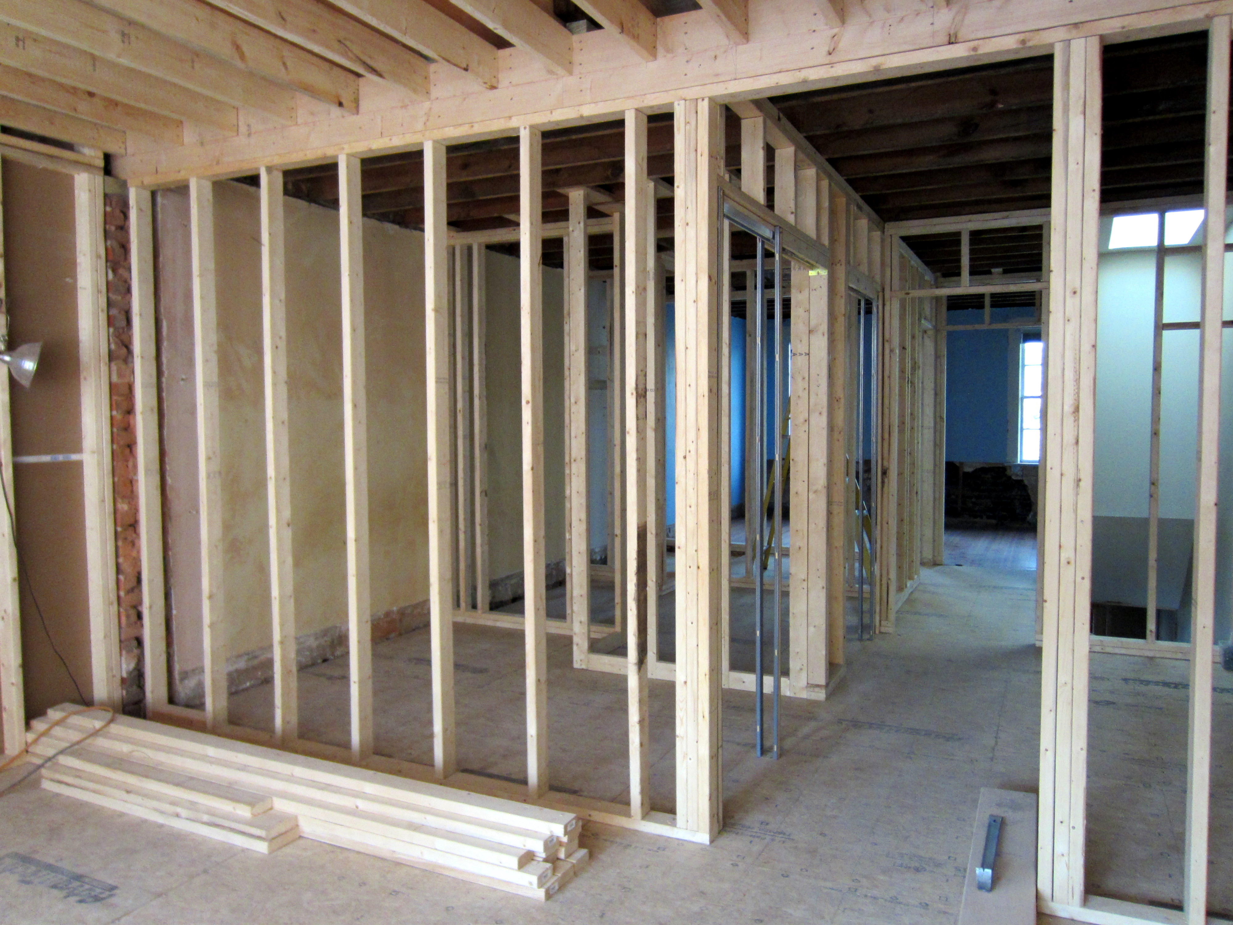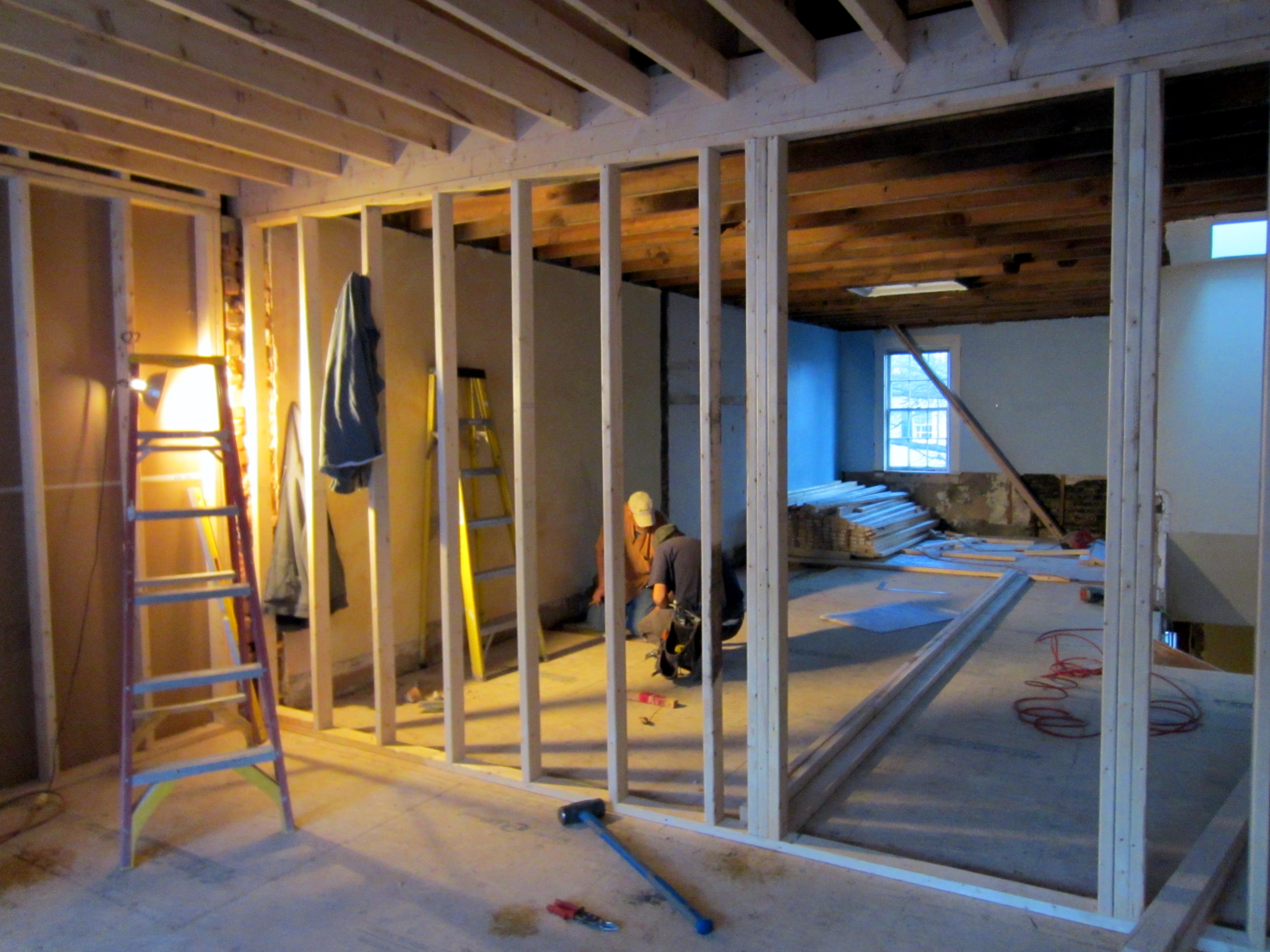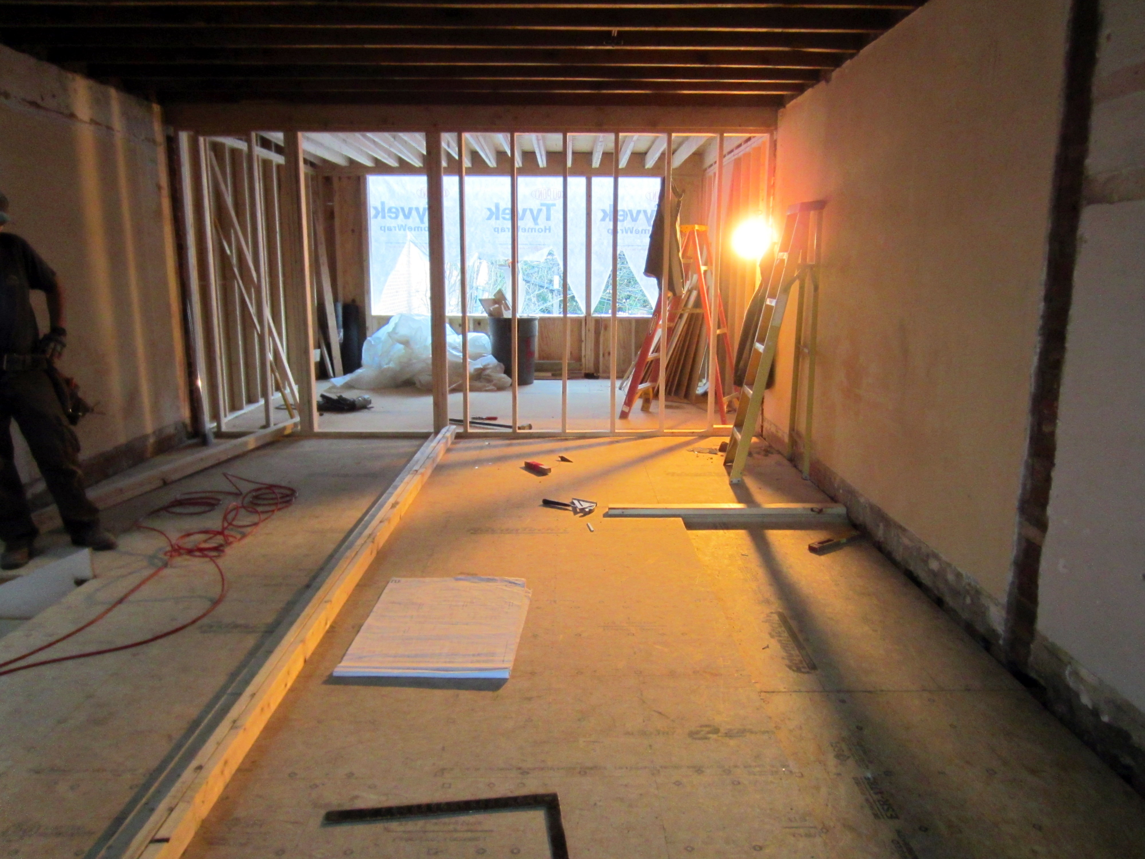 As noted in the previous post (https://wolfestreetproject.com/2012/03/31/transforming-the-first-floor-goals-and-design-plans/), the goal for the first floor is an open-floor plan with a list of specific design elements. The guys began framing the first floor to plan after the second floor was completed.