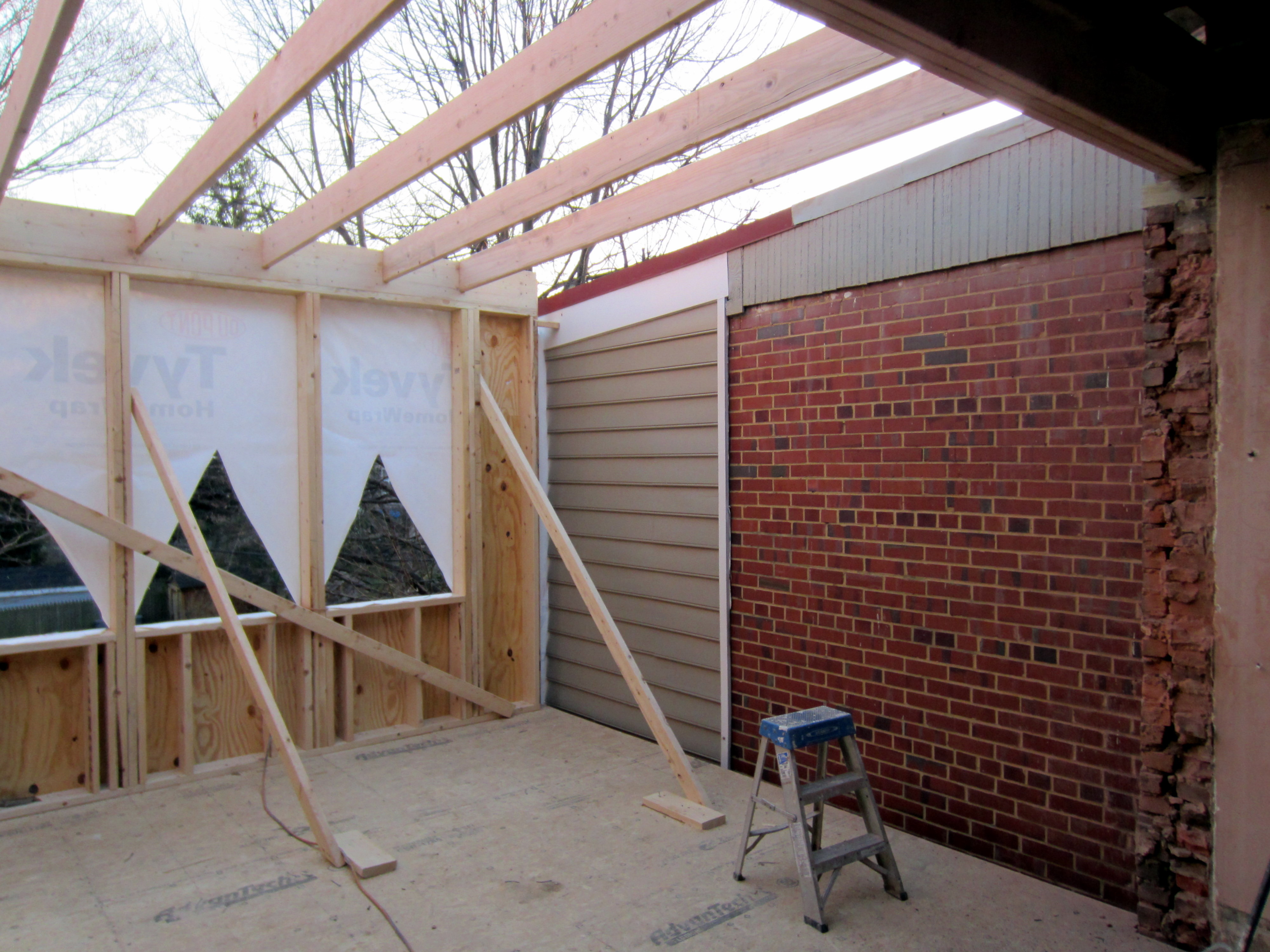 Framing for the entry vestibule and new stair landing has begun at this point (although, upon review of the plan, the landing wasn’t actually correct, as you’ll see at the end of this post).