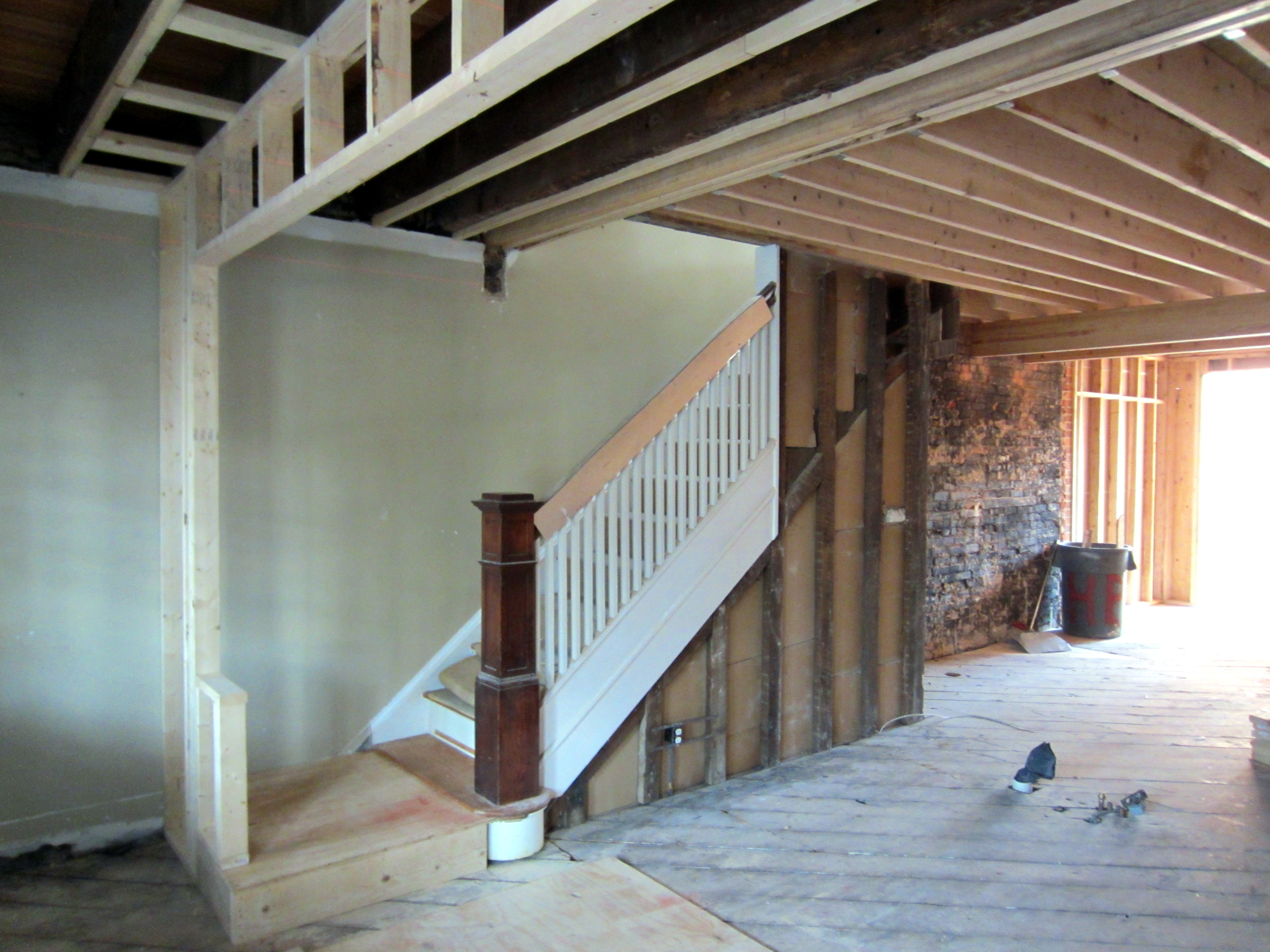 The adjusted landing is shown below. The stair is supposed to come to the center of the newel post, rather than the end, so the guys ripped out what had been constructed and redid the framing and subfloor. They also removed the last tread and two last risers, as well as the cool round trim element that used to be on this side of the newel post. These should be the final portions of the old house that are removed . . .