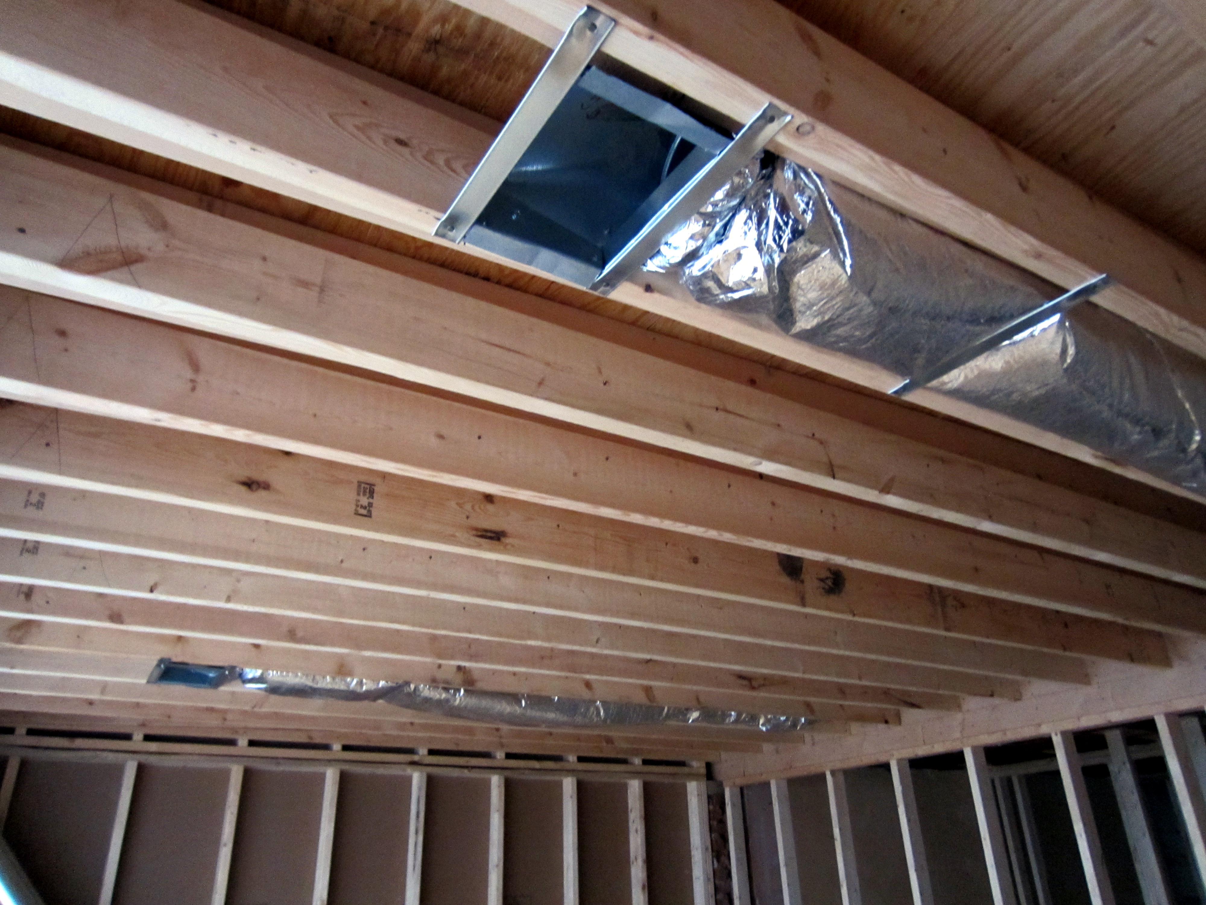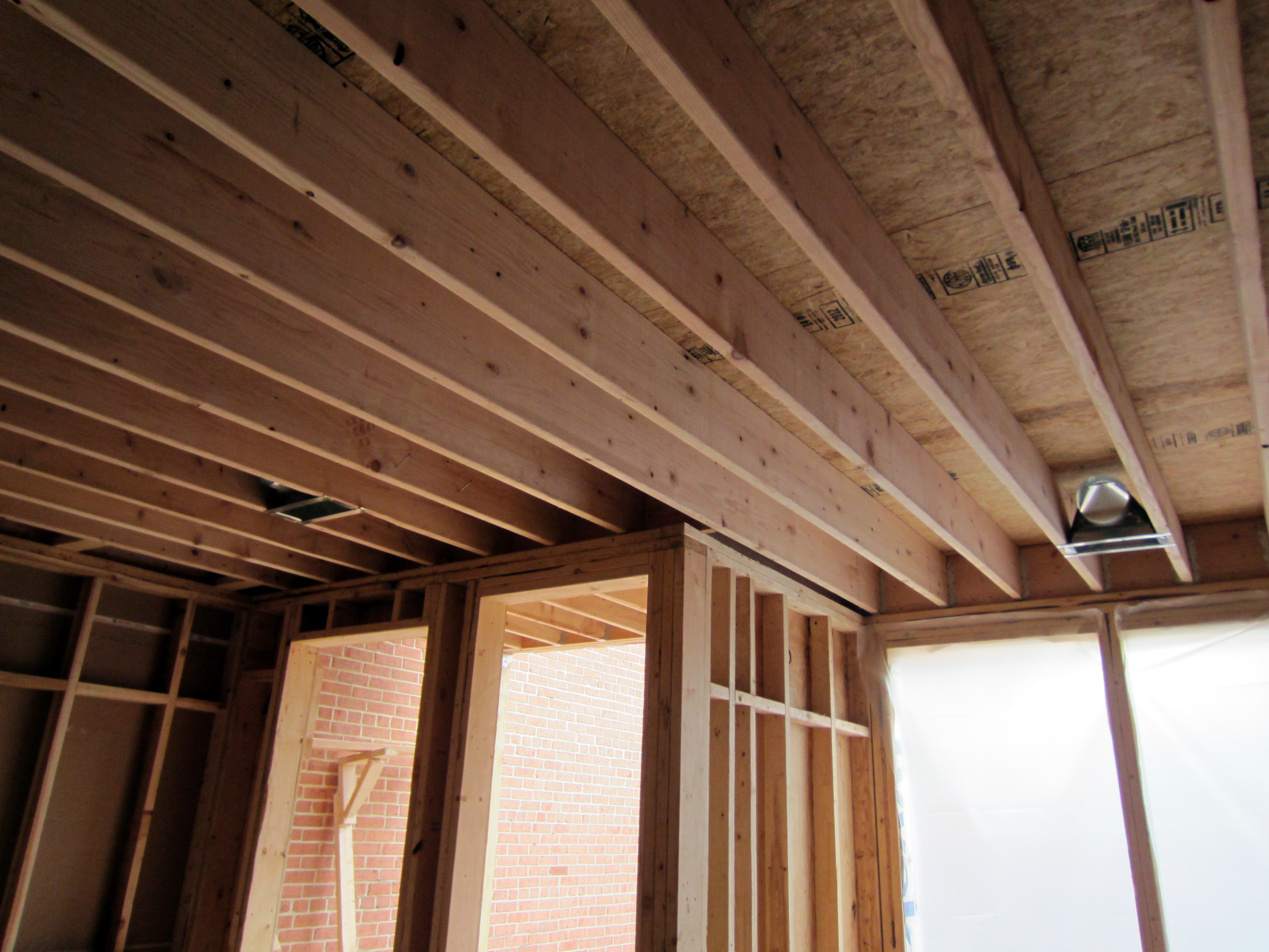 The picture below shows the joist bays after framing has been completed, but before any infrastructure elements have been installed. The triple beams and odd framing on the left side is there to support the showers on the second floor.