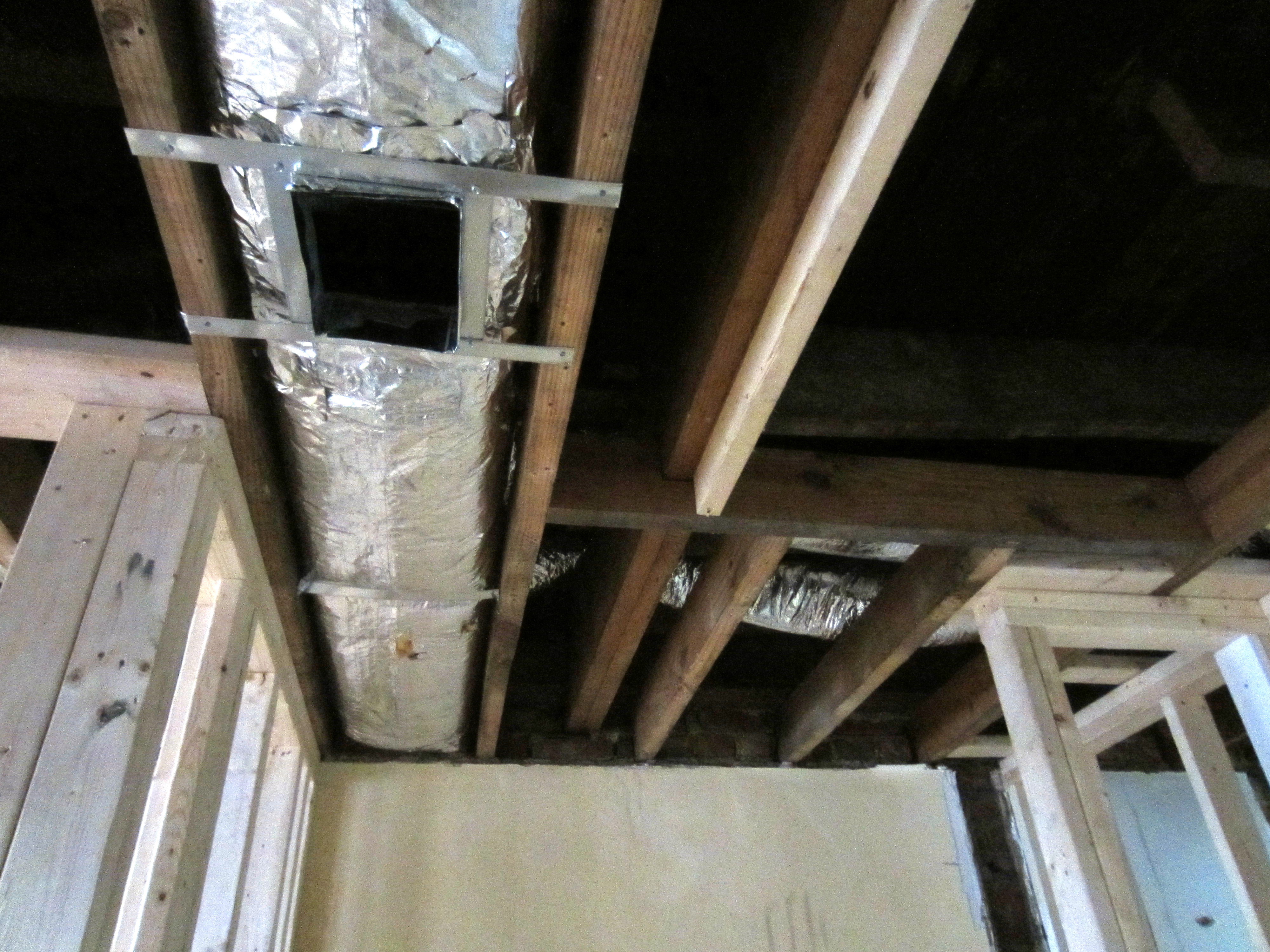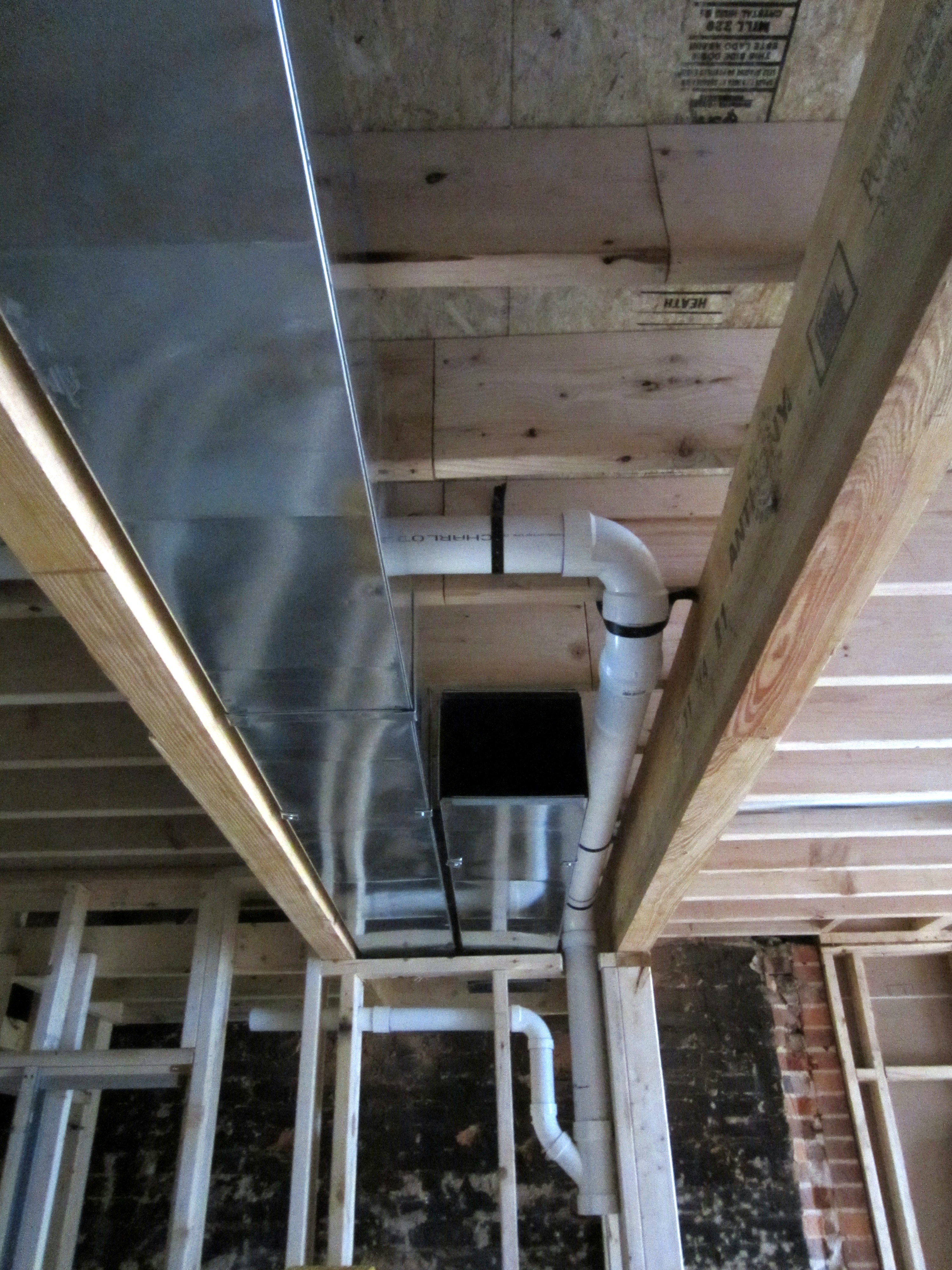 Mechanical, plumbing supply pipes (copper, not PVC . . .), plumbing drain pipes, and electrical for the second floor all needed to live somewhere, and that somewhere would be the “bays” between the new joists installed during the renovation. This post provides a Cliffs Notes version of installation of the house infrastructure elements by way of the evolving bay landscape seen from below, on the first floor.