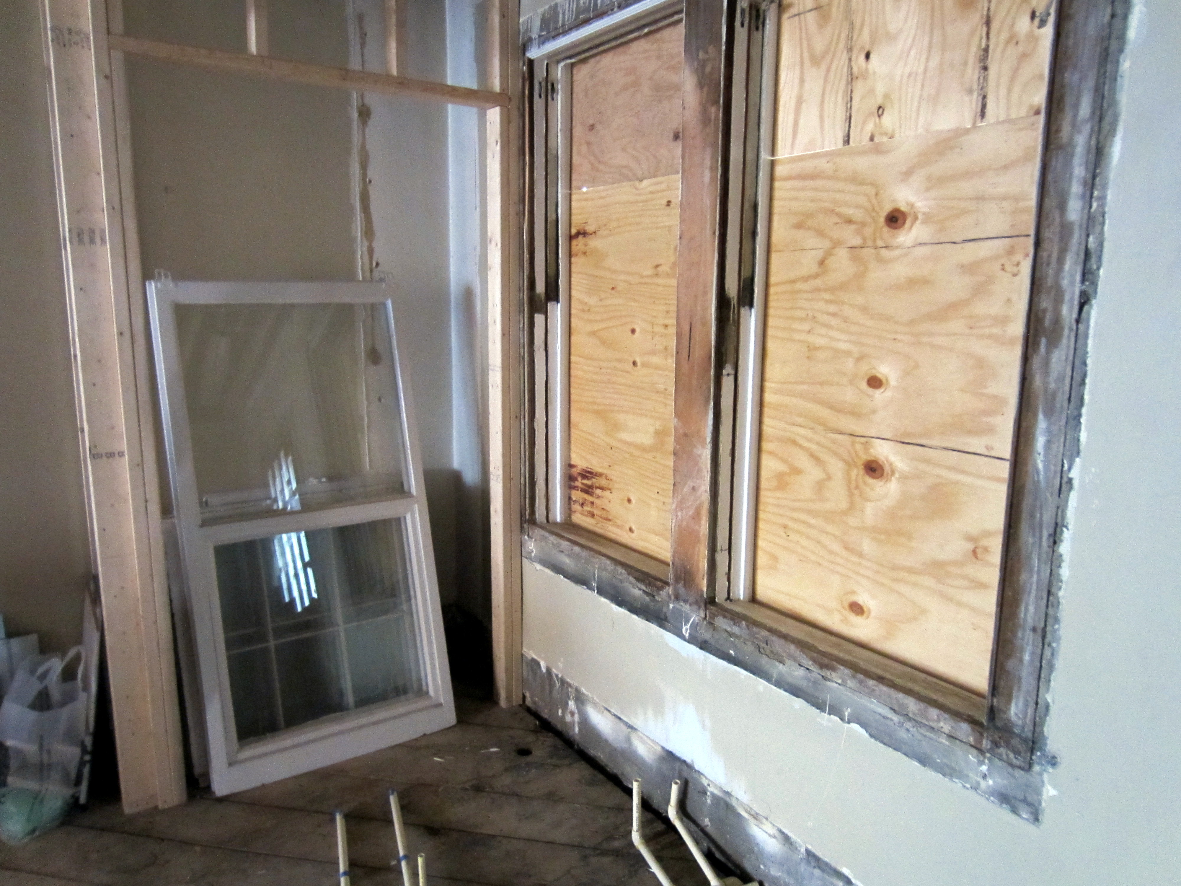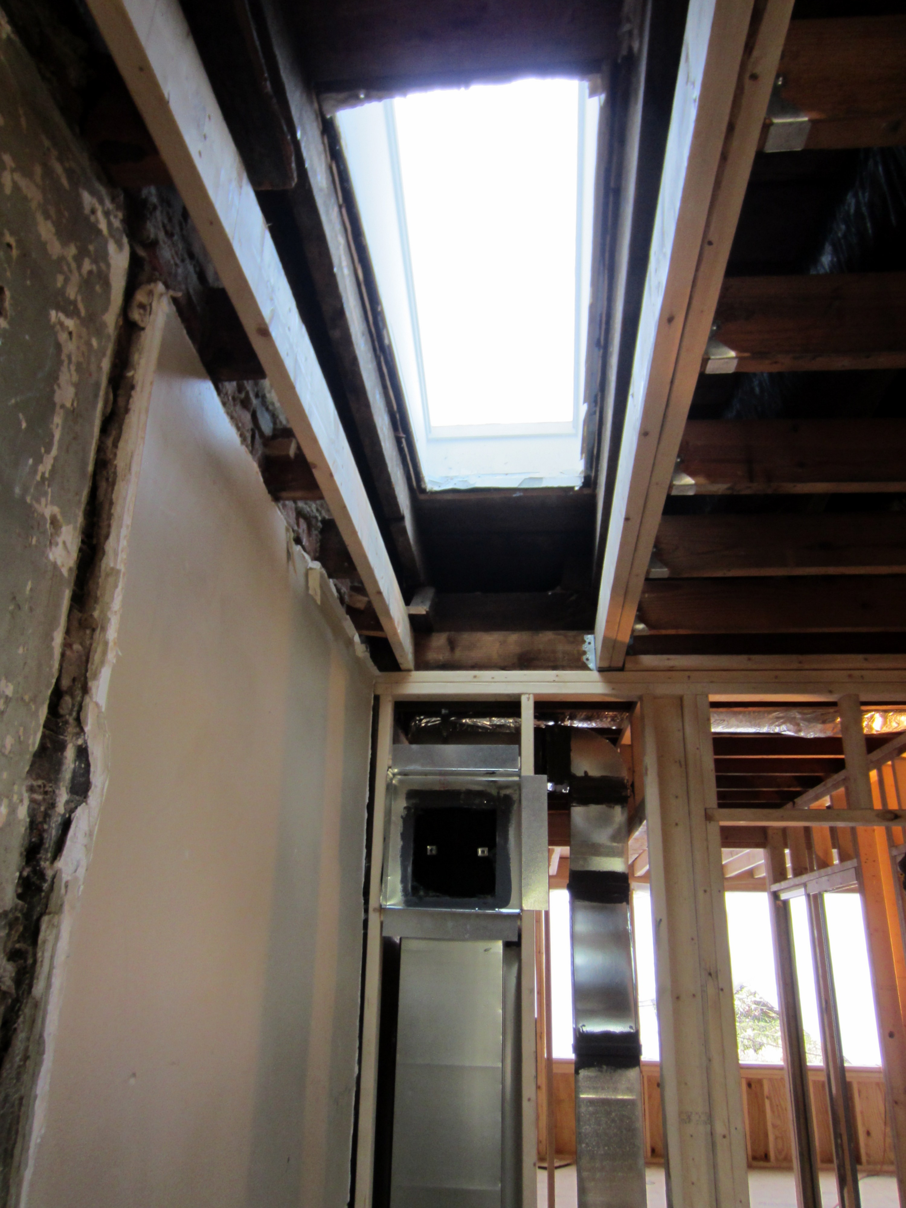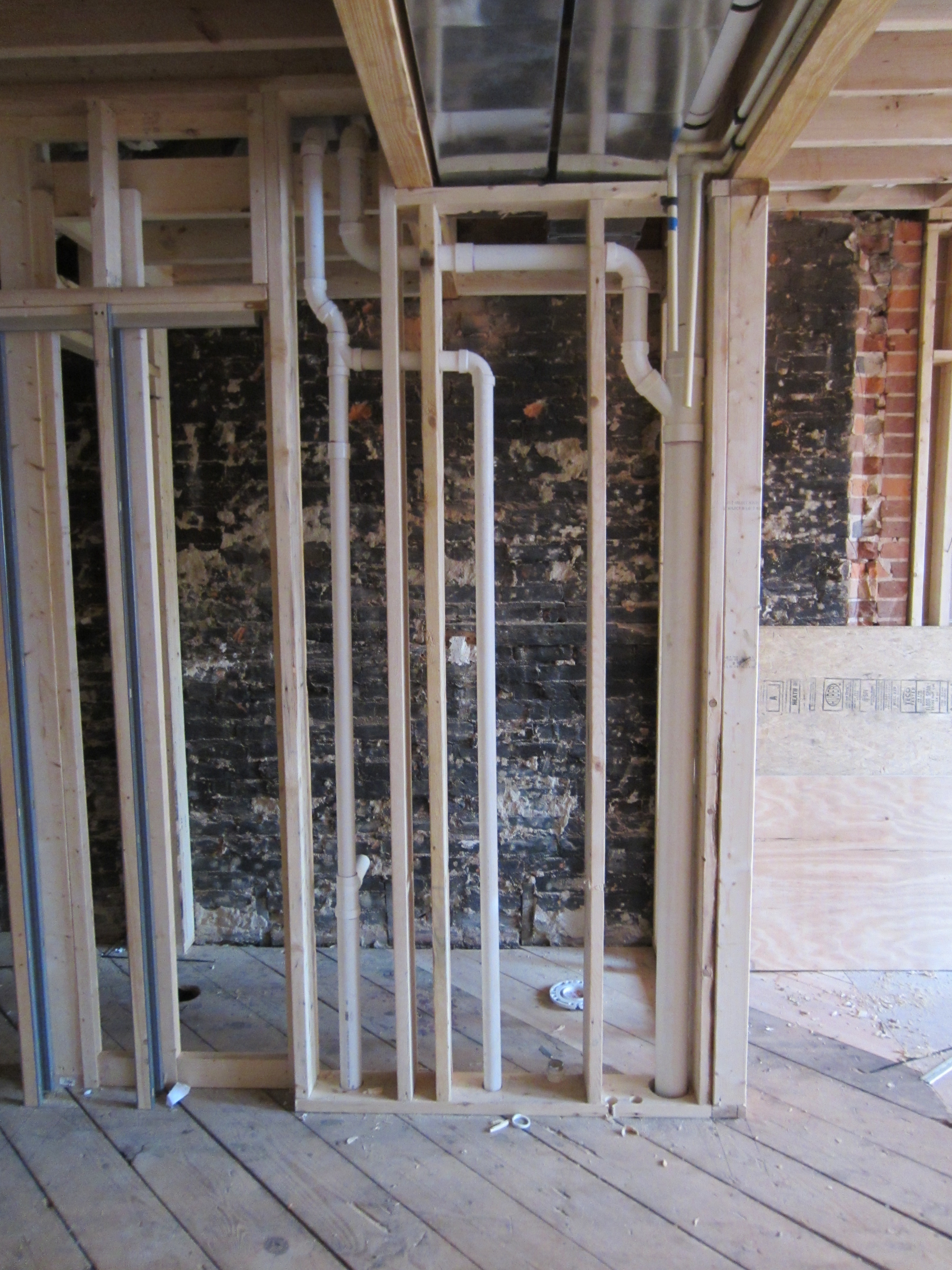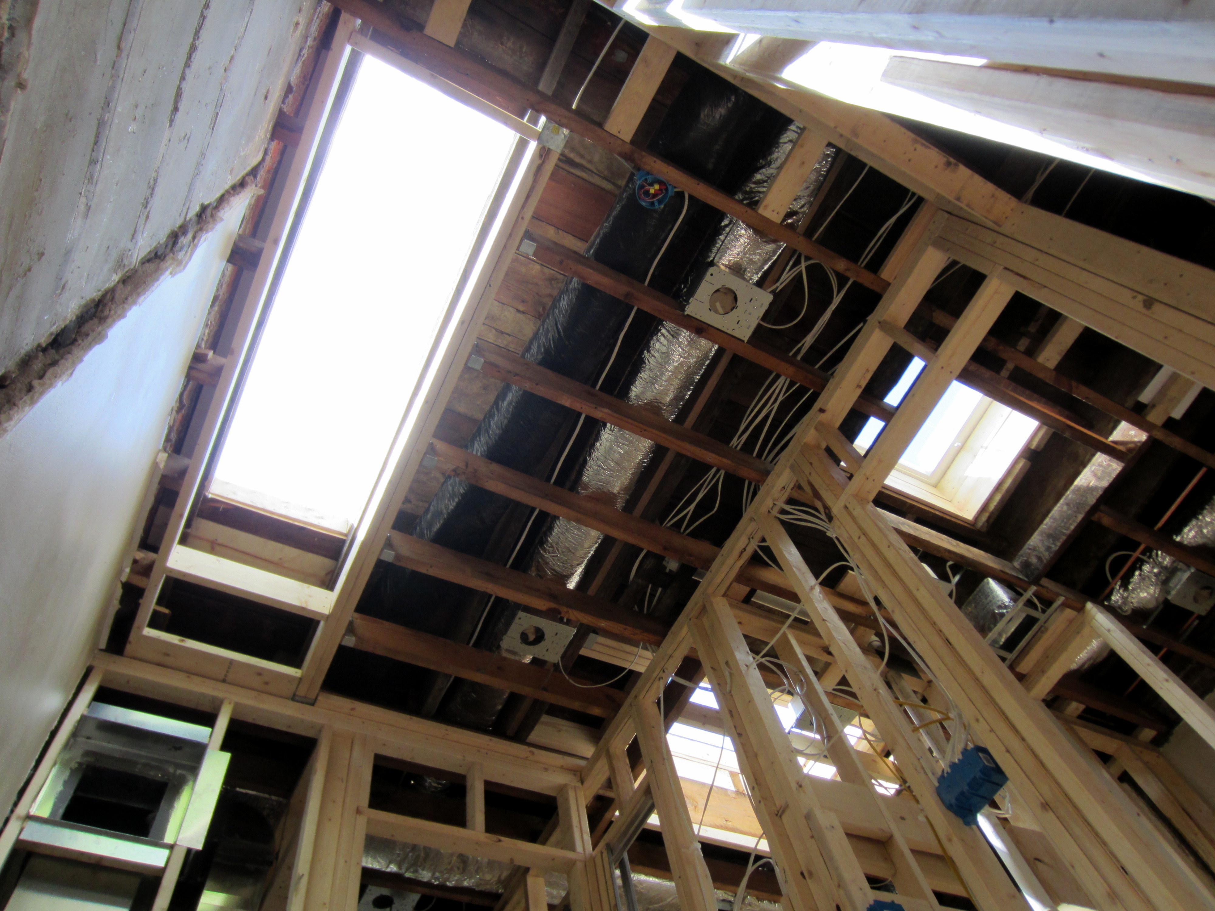 In this view of the bays to the south, the mechanical and drain lines have been joined by copper plumbing supply lines. Note the framing to the right – the original beam arrangement had to be removed and reconstructed after the plumber started doing his thing, and they realized it would not allow pipes to be routed properly.
