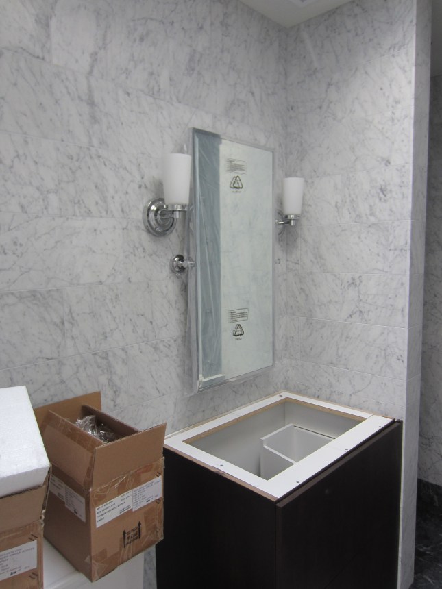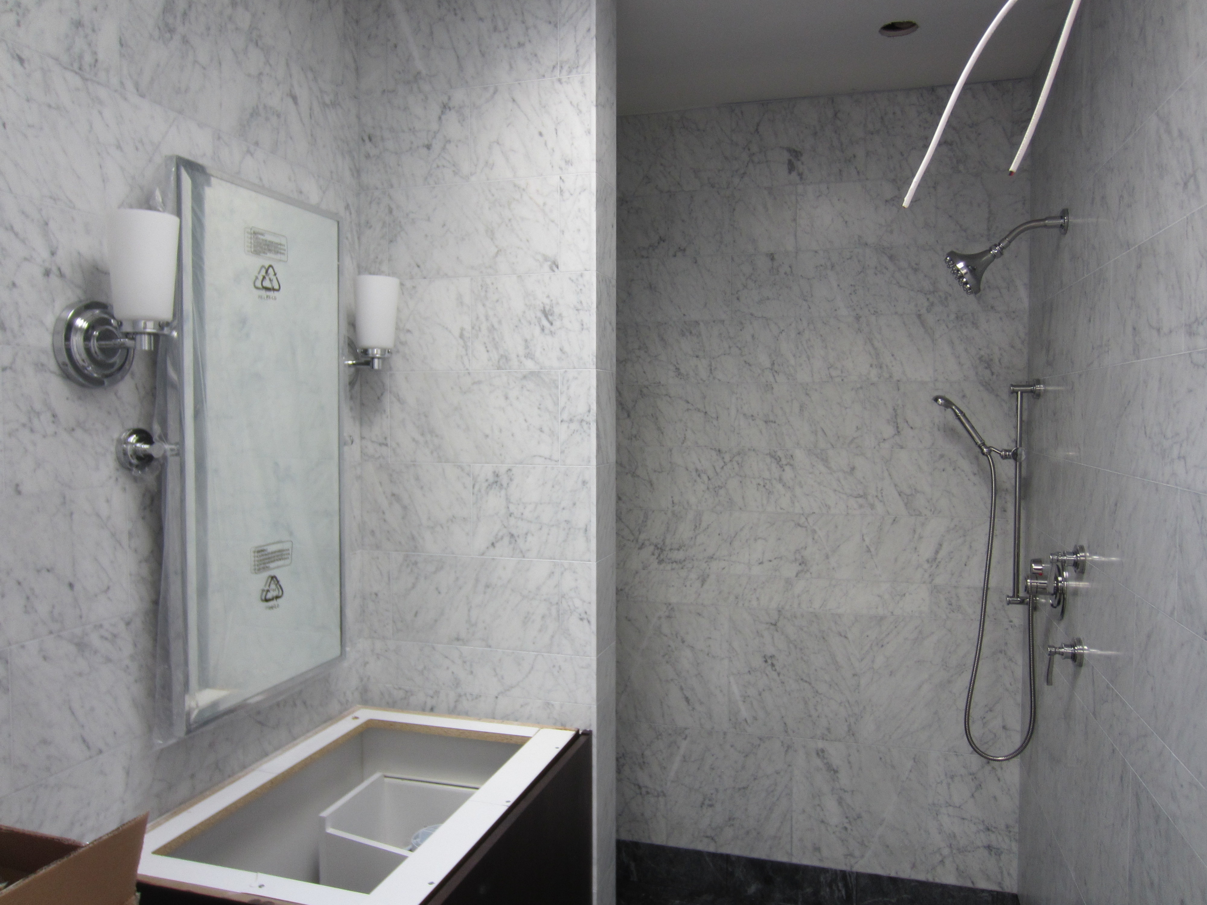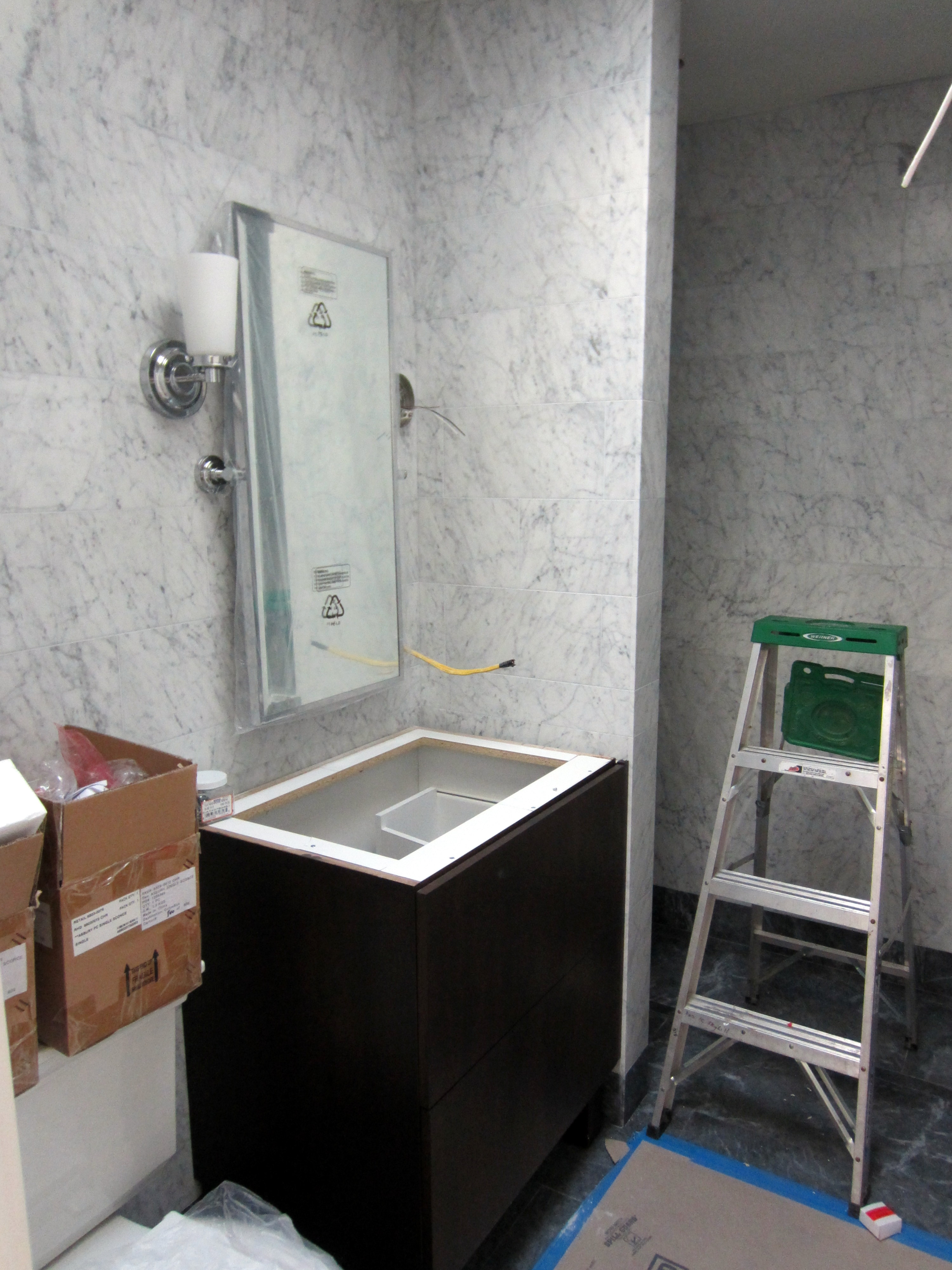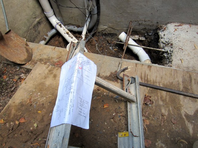 Natalie’s hand-drawn plan for routing the pipes is in the foreground, marked up in red where we just changed the location of the outlet and hose bib from the white trim to the cement wall below.
