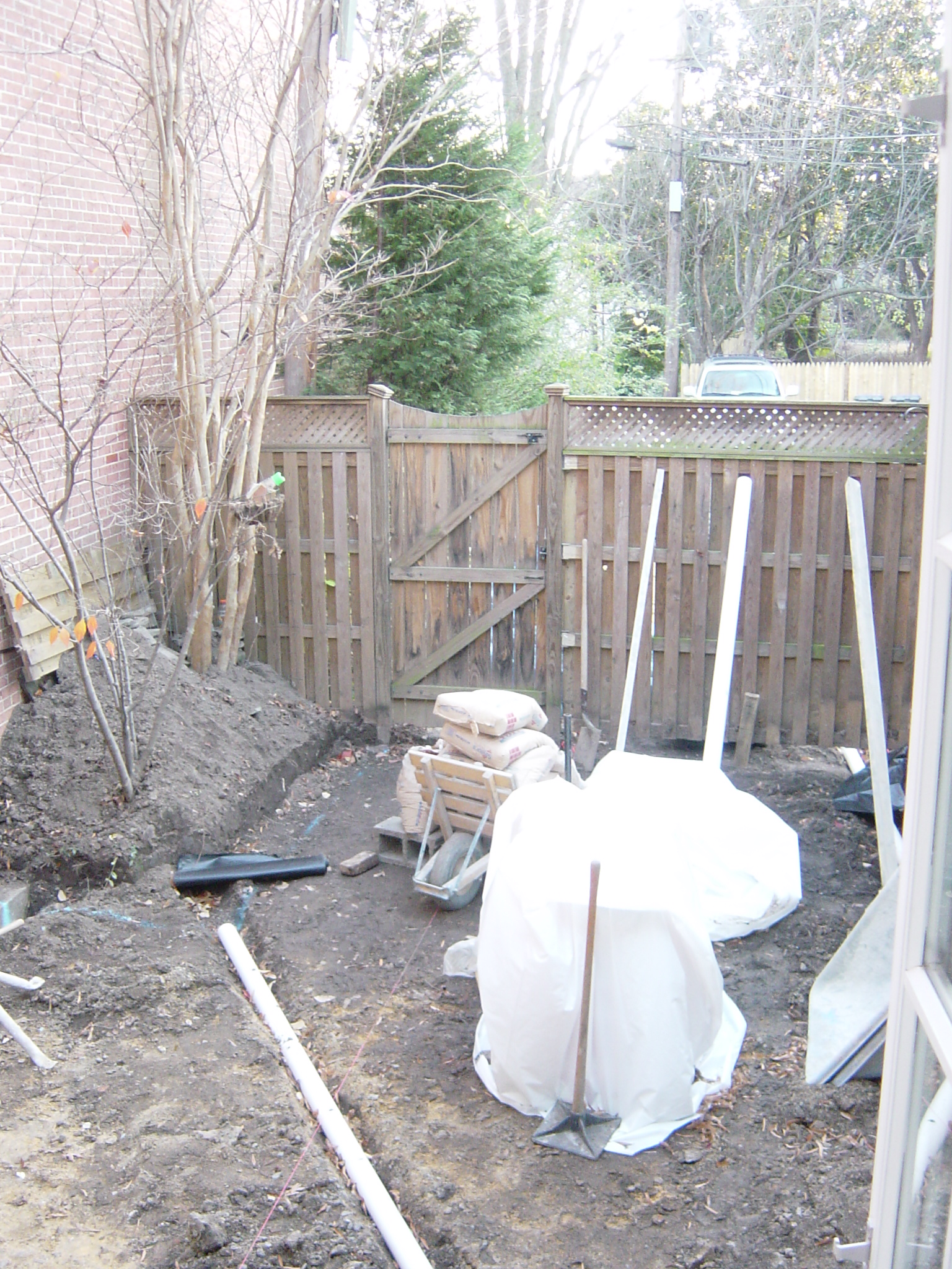You’ll note that the downspout terminates in a mass of conduit that we installed when the backyard was hardscaped in 2007:
