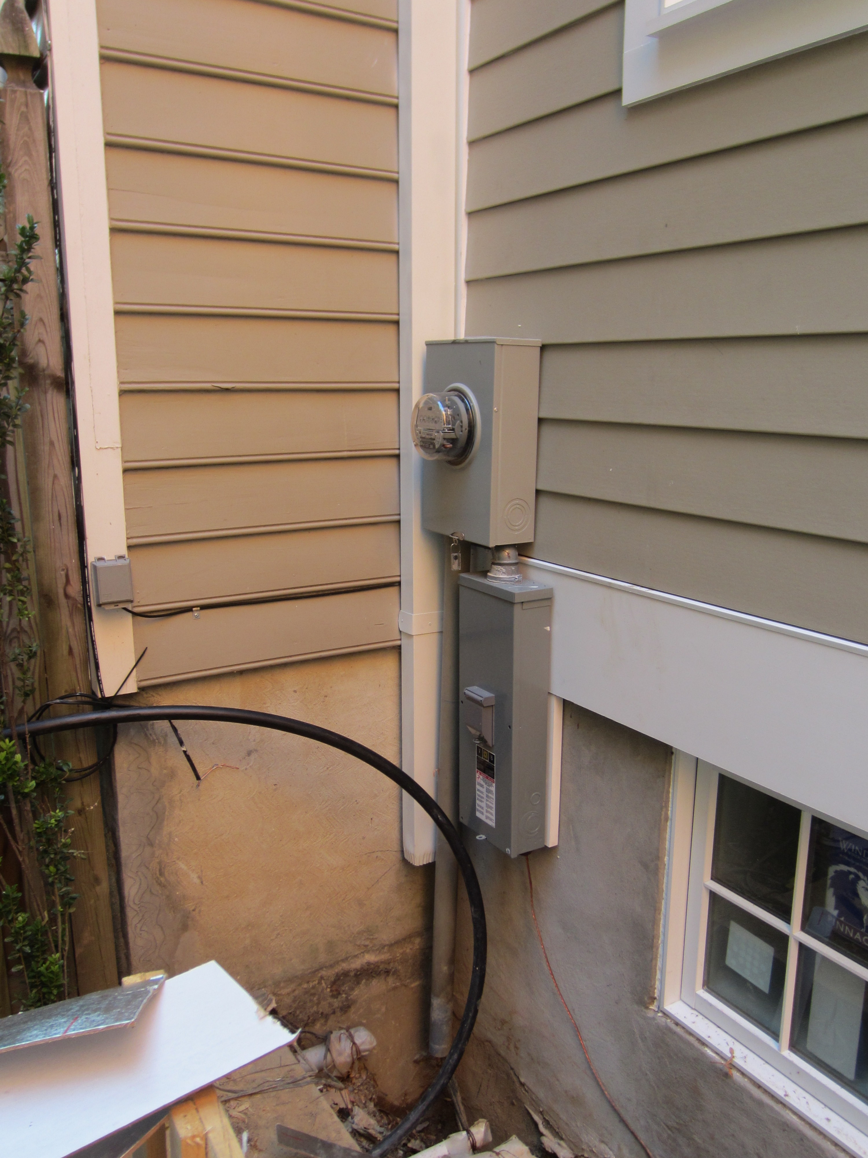 Because the black gas line conduit was being used to route cable to the outdoor TV, and because cable lines would enter and exit the house on the other side of the electrical panel, this was moved to the other side of its brethren before finalizing the arrangement and cement was poured.