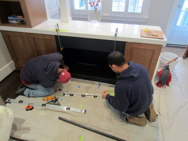 The guys from our neighborhood counter top firm ended up coming twice to install – the first time the surround did not fit perfectly, plus, the lead installer identified a structural enhancement that would address a stability risk that existed if we just adhered the face to the fireplace frame without any load-bearing by the floor.