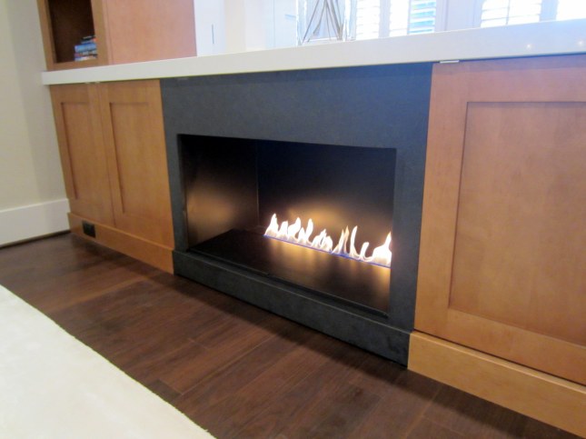 The functional element of the design referenced above was a 3/8″ gap between the bottom of the surround and the floor. This subtle gap is sufficient to provide the oxygen supply to the gas fireplace without distracting from the overall aesthetics of the surround.