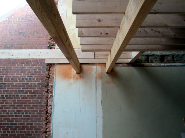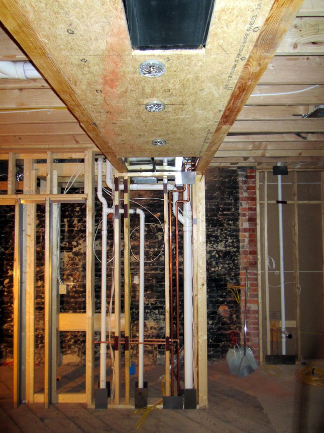 Here’s a closeup, and another episode of anxiety-inducing stress. The plumber assumed that cement backer board would be applied to the west wall (the stark crimson/magenta wall that Mason has correctly identified is actually readily discernible, contrary to my assertions . . .). However, no backer board is needed, and we’re happy with a little extra space in the shower. As a result, though, the shower fixtures are not centered. We almost lost it.