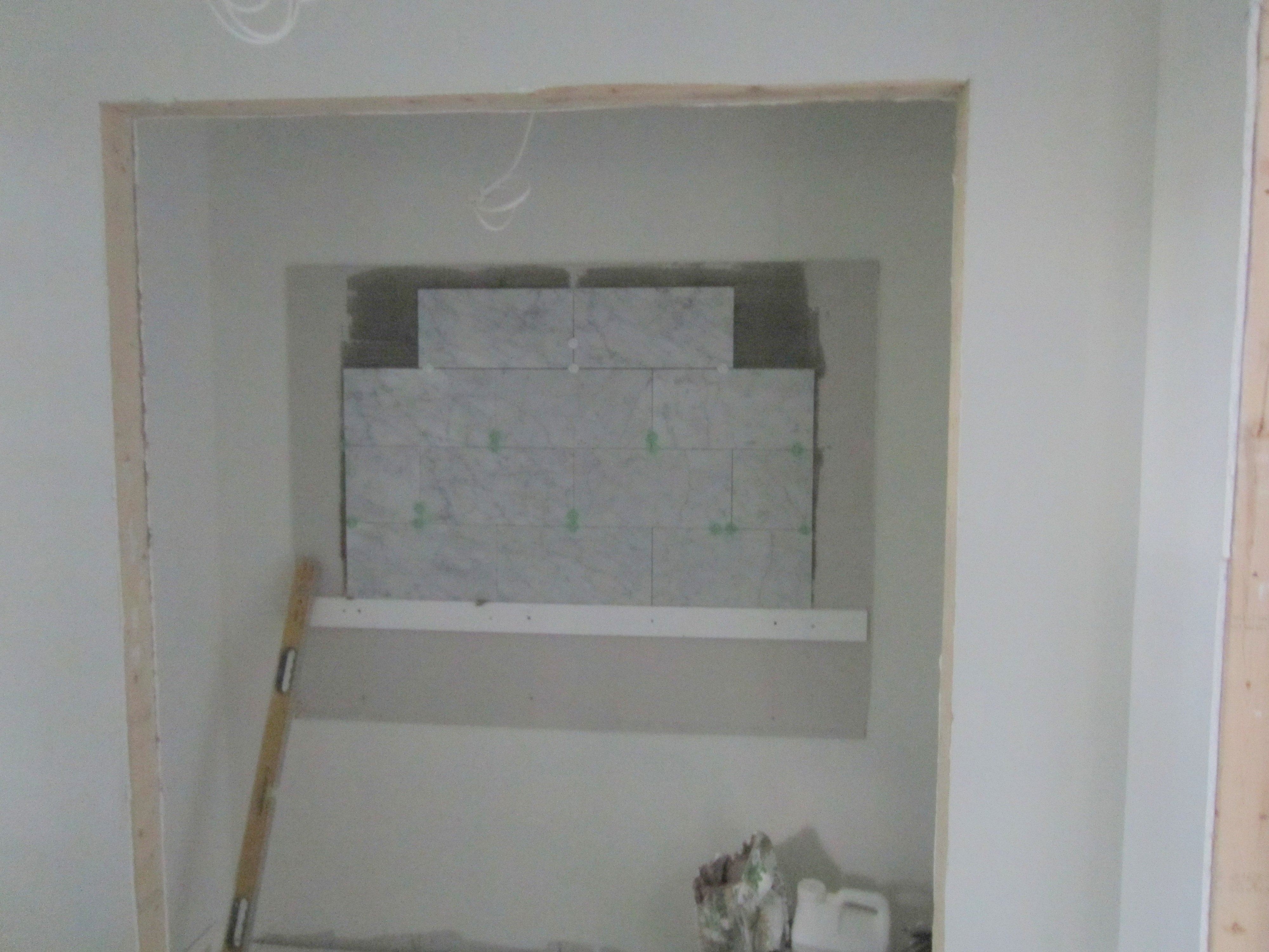 The joints on the north wall were grouted first to allow the vanity to be installed.