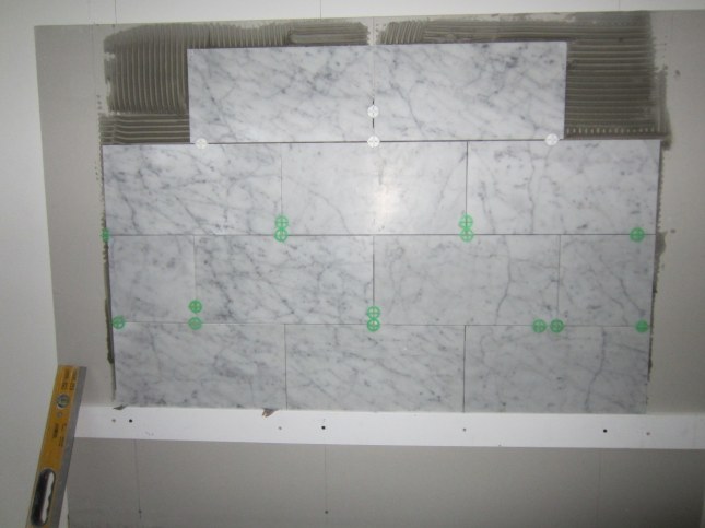 While we were away, the first floor was proceeding swimmingly, but we did receive a disconcerting call regarding the master bath, which had been completely tiled before we left. The tiles were, uh, falling off. Because the Crema Ella marble was honed on both sides (rather than honed on one side and rough on the other), the thin-coat mortar didn’t fully adhere.