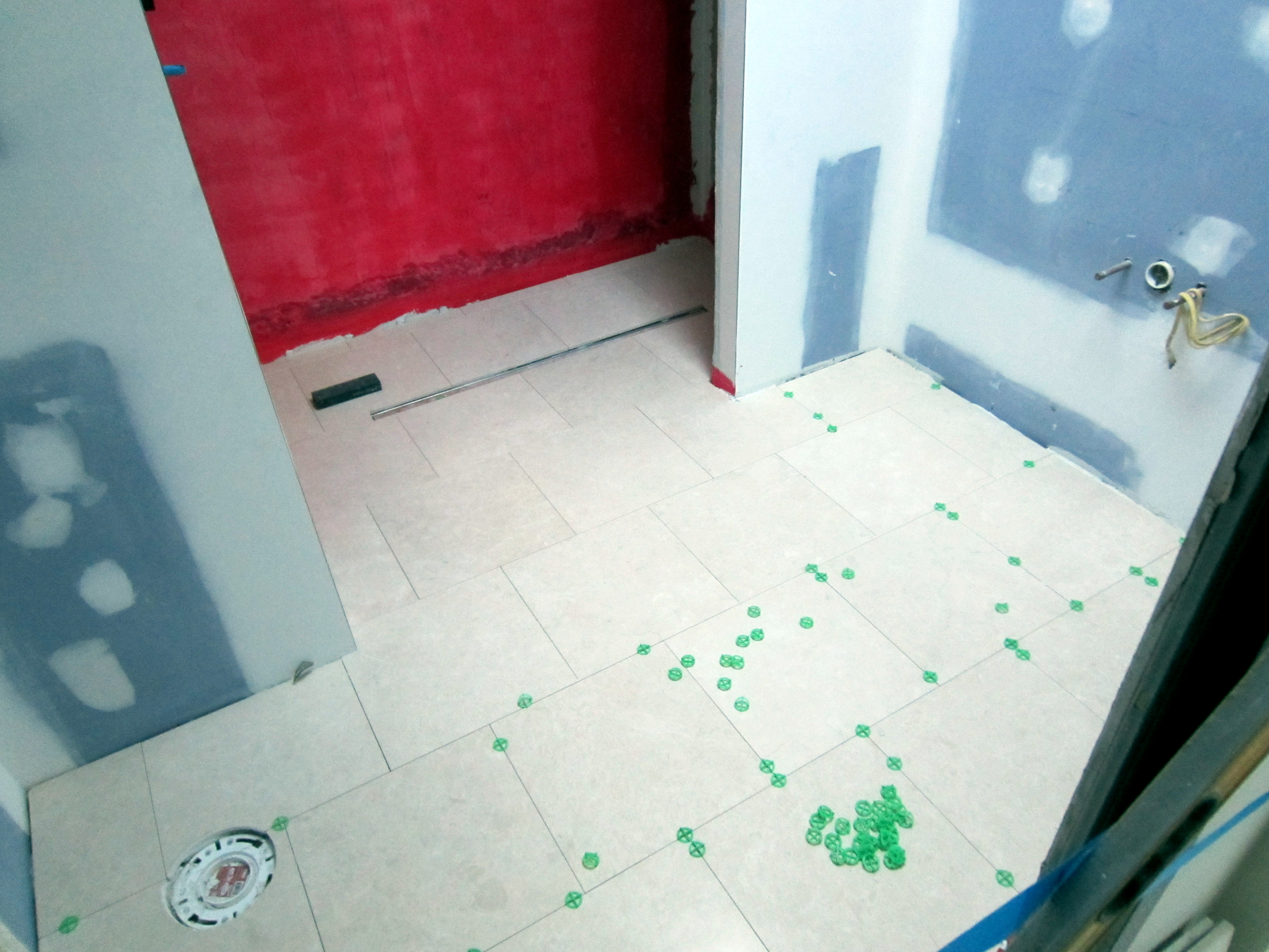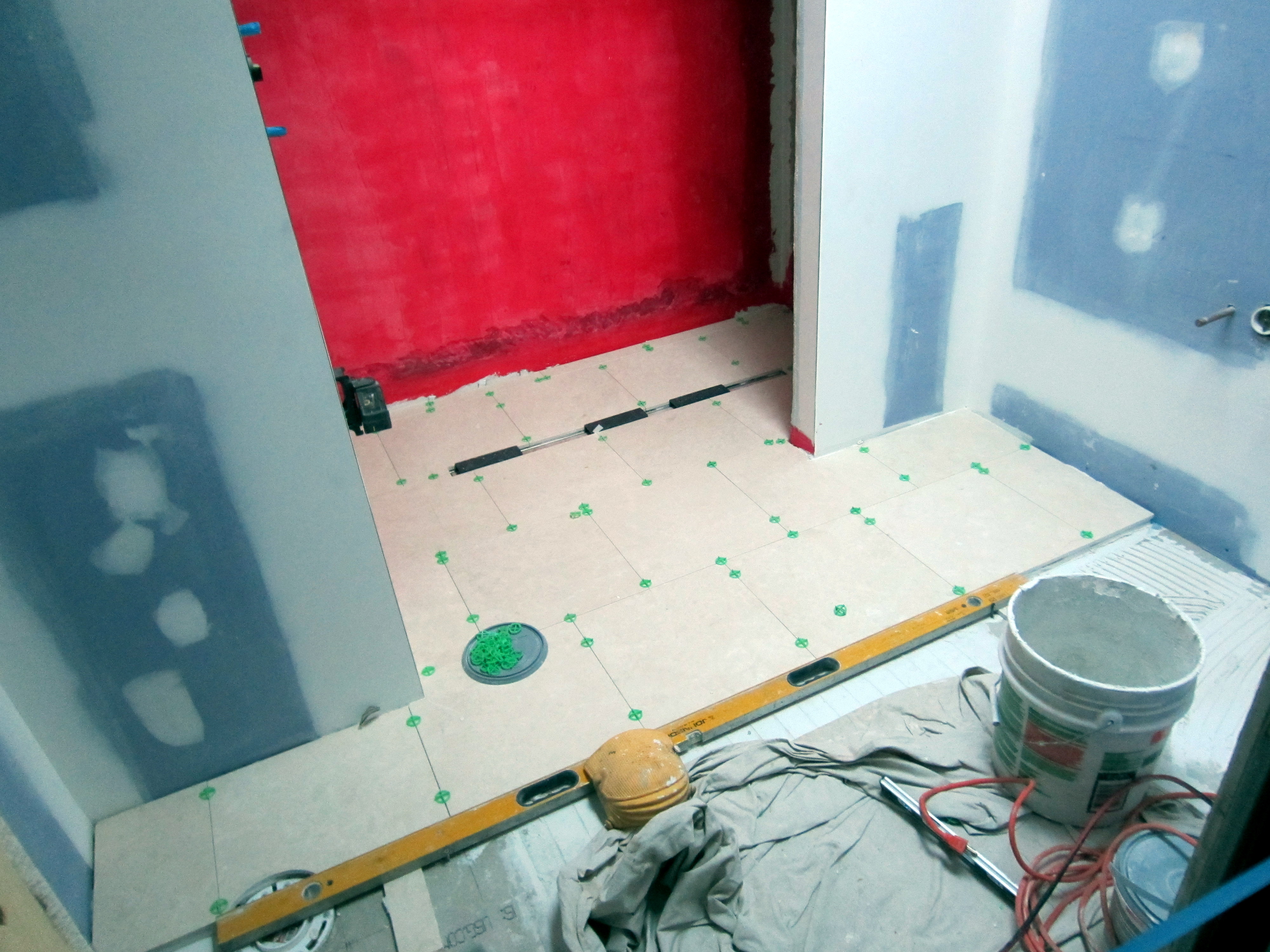 The tiles begin to spread eastward. In the shower, placeholder buffers define the long Kerdi drain, which will be tiled in the middle.