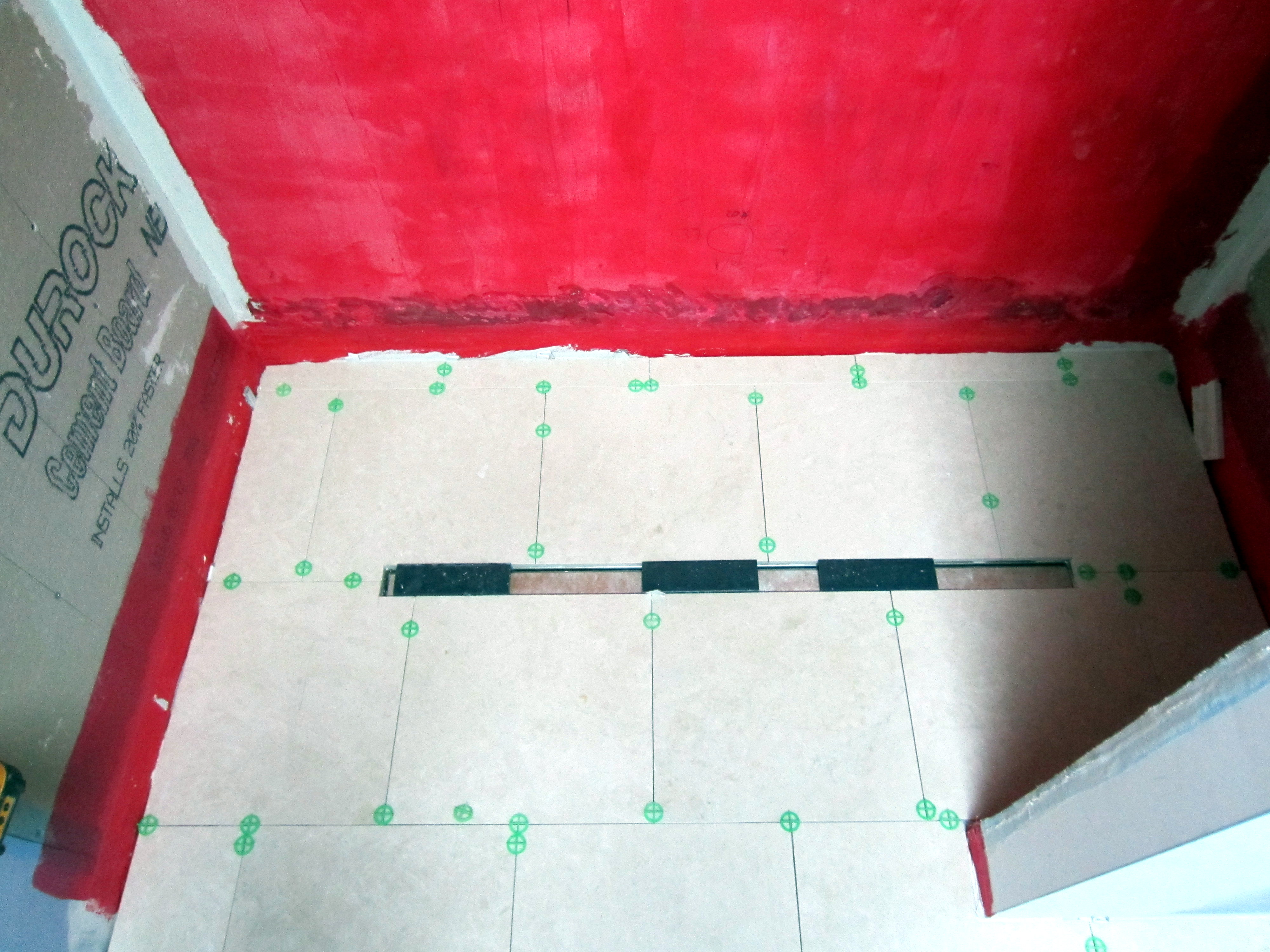 Here, the Kerdi system and long, rectangular drain have been installed in the master bath: