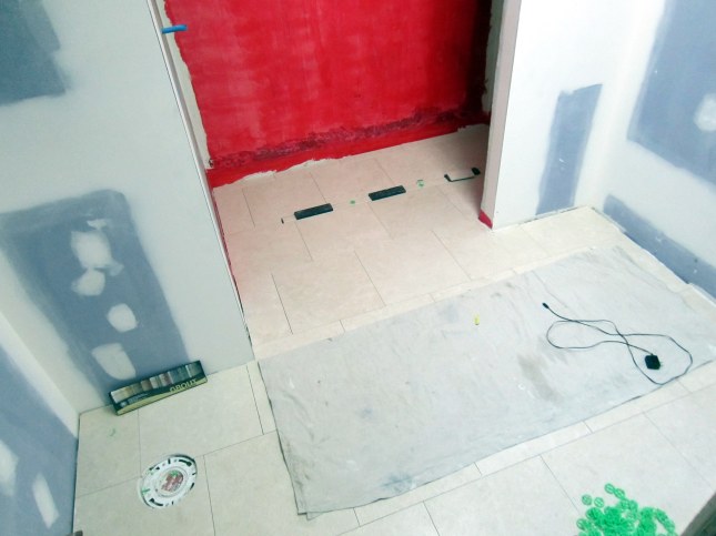 In the guest bath, floor tiling also moves forward. The electric mat also has been installed.