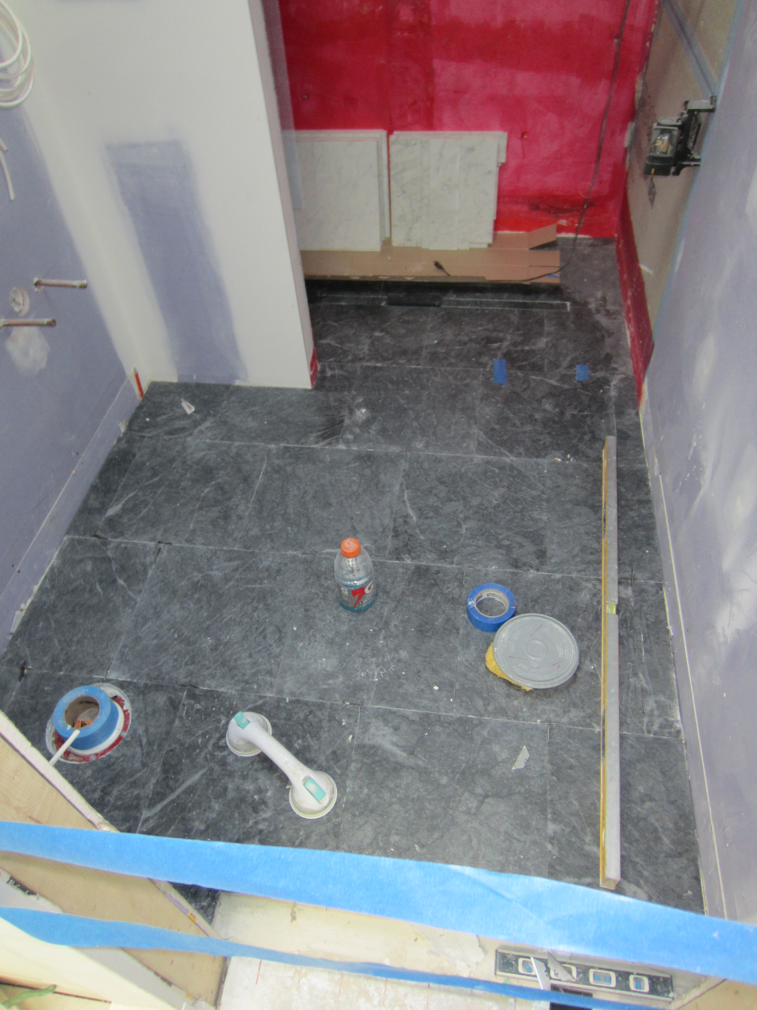 Flooring essentially is complete in the photo below (the tile was selected to appear as an inverse of the white wall tile with grey veining). The joints, which are 1/32″ were spaced using the large ends of razor blades (you can see one laying on one of the tiles and another nearby in a joint between tiles . . .).