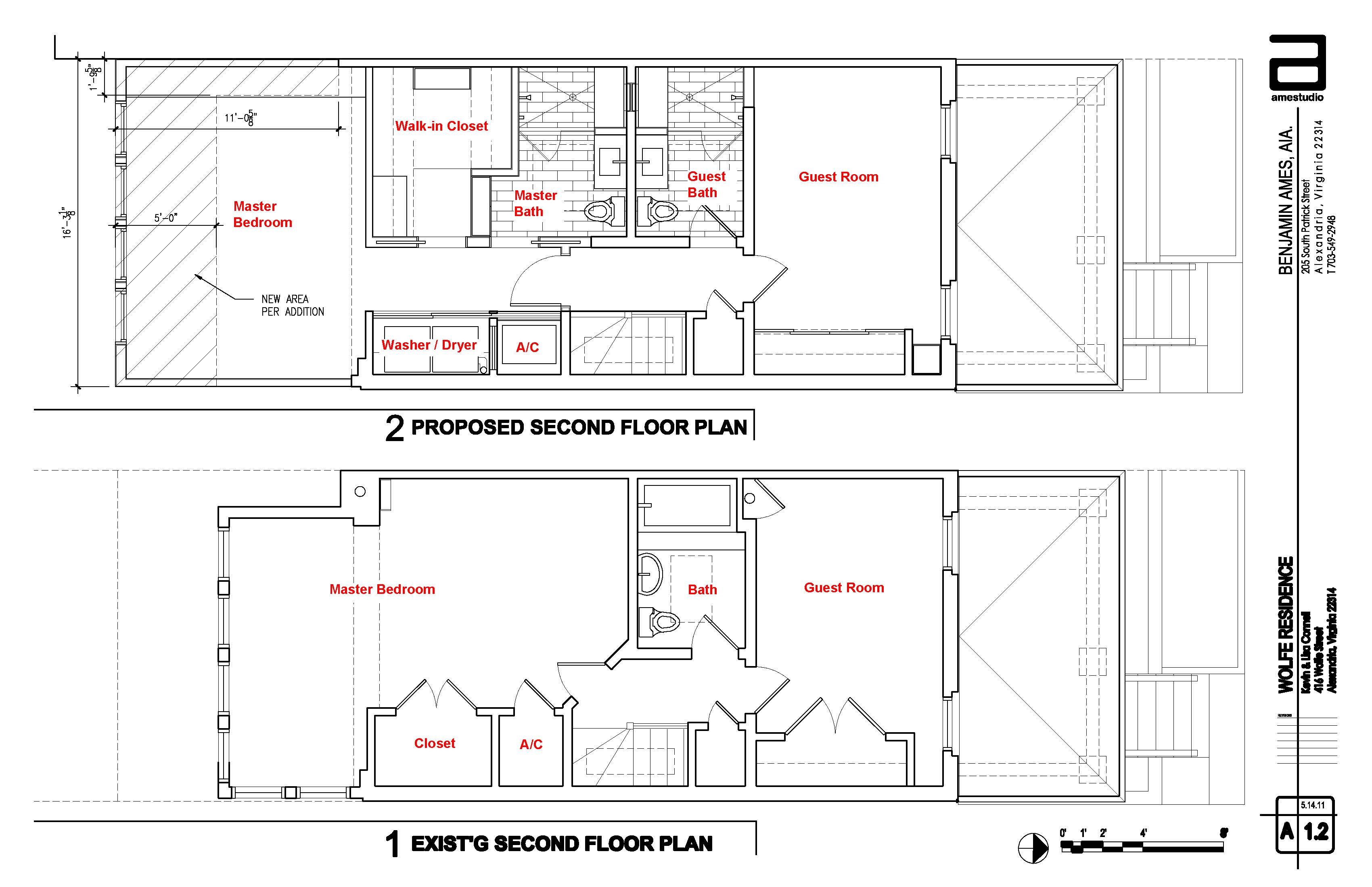 The floor plans for the before (bottom) and after (top) designs for the second floor are presented below.