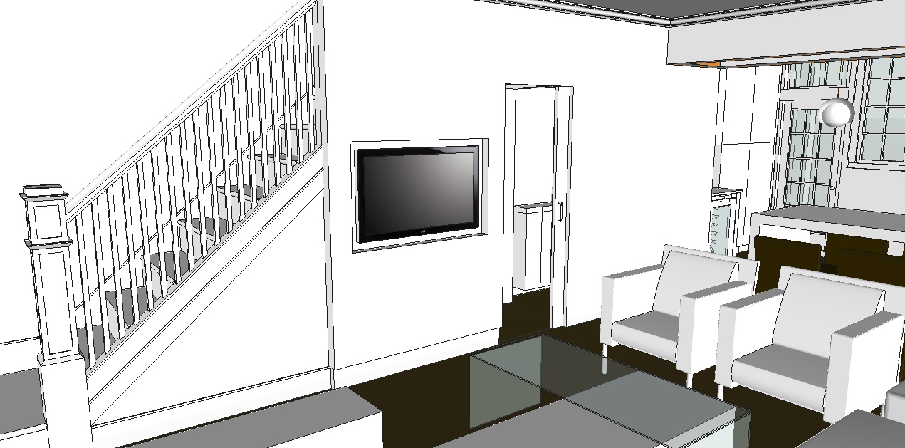 A niche will now house AV components, so the furniture can be located against and perpendicular to the east wall, opening up the space and allowing for enjoyment of the fireplace (which is to the left in this view). We’ve taken great pains to protect and preserve the original newel post and staircase, since these are the only remaining elements of the original house (and also served as grounding for the design of the house, so we didn’t get too contemporary, and tried to maintain fidelity to the original essence of the 1925 structure).