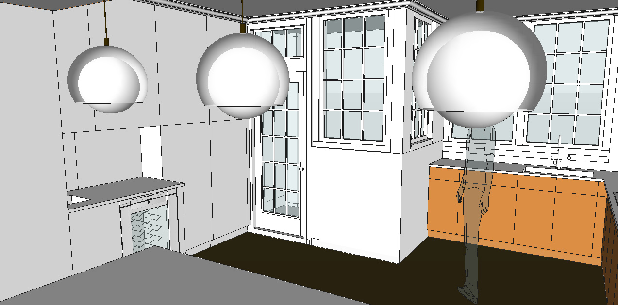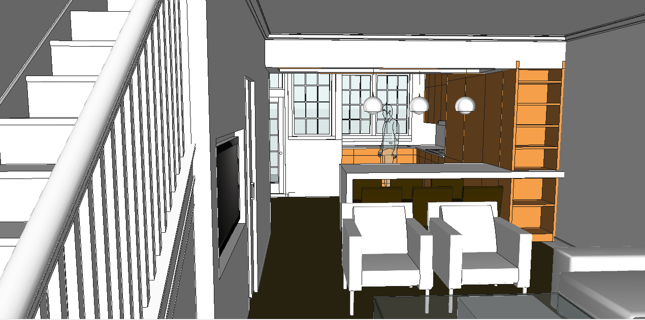 The overall vision for the peninsula is presented in 3D below, from our design work with Ben in 2011, before renovation actually began (check out the crazy thin-ass crown molding!):